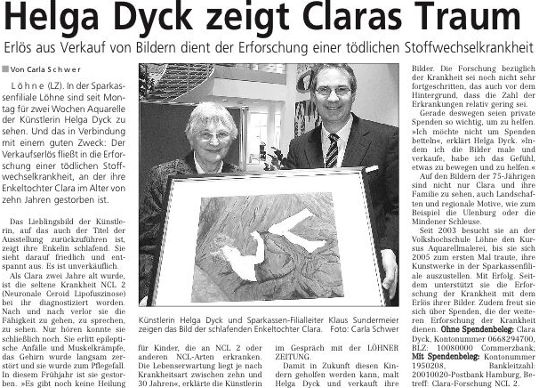 Neue Westfälische, 16. Dezember 2011 Für Clara und andere Kinder (pdf) Westfalen-Blatt, 11. November 2011 Helga Dyck zeigt Claras Traum (jpg) NW-News, 11. November 2011 Da zählt jeder Euro (pdf) Welt am Sonntag, 25. September 2011 Die Geschichte unserer Tochter, Titelbild (pdf) Die Geschichte unserer Tochter, Artikel (pdf) Berliner Morgenpost, 25. September 2011 Es soll etwas von ihr bleiben (pdf) NCL-Gruppe, Mitglieder-Information 02/2011 Bericht über die Ausstellung in der Kursana-Residenz (pdf) Pyrmonter Nachrichten, 19. Februar 2011 Ausdrucksvolle Bilder für einen guten Zweck (pdf) Pyrmonter Nachrichten, 26. Januar 2011 Claras Traum: Oma malt für kranke Enkelin (pdf) Westfalen-Blatt, 3. Februar 2010 Mit den Bilder verbunden (pdf) Klinik-Zeitung Klinikum Herford, Februar 2010 Kunst im Klinikum: Malen für Clara und all die anderen Kinder (pdf) Herforder Wochenanzeiger, 19. Dezember 2009 Malen für Clara und all die anderen Kinder (jpg) Westfalen-Blatt, Löhner Zeitung, 15. Dezember 2009 Malen für die Enkelin - Helga Dyck stellt aus (pdf) Neue Westfälische, Herforder Kreisanzeiger, Kunst für die Erforschung einer tödlichen Krankheit (jpg) gleicher Artikel im Seitenlayout (pdf) Westfalen-Blatt, 21. April 2009 Oma malt für ihre todkranke Enkelin (pdf) Vlothoer Anzeiger, 21. April 2009 Wenn der Mann aufs Mittagessen verzichtet (pdf) Bild der Frau, 17. Januar 2009 Wir kämpfen um jeden Tag (pdf) FAZ, 8. Oktober 2008 Gefrässige Leere im Kopf (Teil 1) (pdf) Hirnstammzellen als Hoffnungsträger (Teil 2) (pdf) Welt am Sonntag, 12. Oktober 2008 Claras Abschied (pdf) Berliner Morgenpost (BIZ), 12. Oktober 2008 Geliebtes Kind (Titelseite) (pdf) Geliebtes Kind (Artikel) (pdf) ZDF heute-journal, 11. April 2008 Fernsehbeitrag zur Stammzelldebatte im Bundestag,leider inzwischen nicht mehr in der Mediathek verzeichnet. FAZ, April 2008 Letzte Rettung für Clara (pdf) Löhner Zeitung, Juli 2005 Neue Westfälische, Juli 2005 Wie Bilder Clara helfen (jpg)